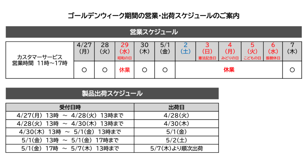 ゴールデンウィーク期間の営業日と出荷スケジュール